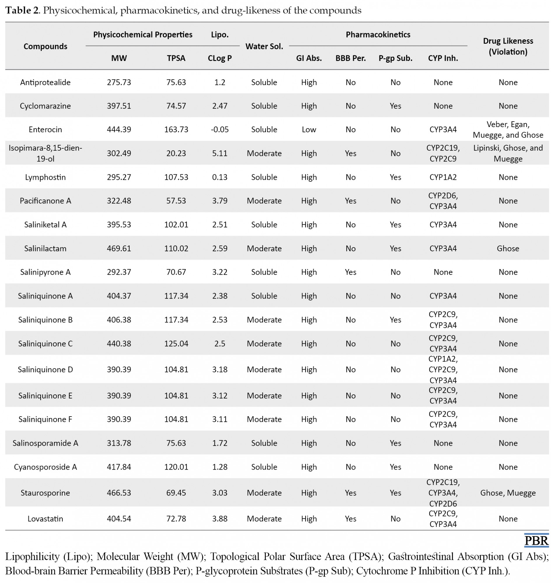 Table 2 presents the results of drug-likeness and ADME investigations for Salinispora-derived compounds, which were involved in this study. In silico calculation of physicochemical and pharmacokinetic properties and drug-likeness analysis, ligands were performed using the SwissADME server [